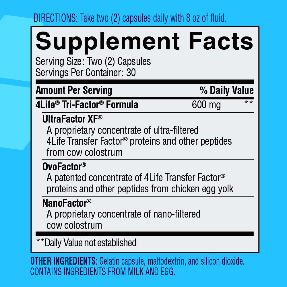 4Life Transfer Factor TriFactor Formula contiene ingredientes hechos por el sistema inmunológico para el sistema inmunológico. Las moléculas mensajeras encontradas en este producto ayudan a educar a las células inmunitarias y a respaldar la capacidad del sistema inmunológico de reconocer posibles amenazas para la salud, responder antes ellas, y recordarlas más eficazmente. *Certificación Halal, disponible en cápsula vegetal (Certificación Kosher).