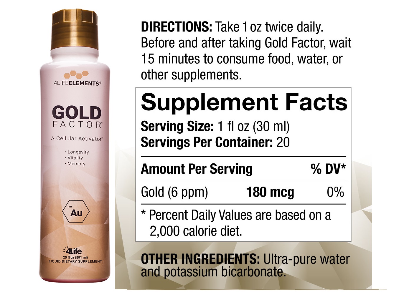 Gold Factor es una molécula de activación ampliamente investigada que impulsa la vitalidad celular para respaldar la agudeza mental y la memoria, así como para promover la longevidad al proteger el ADN celular.